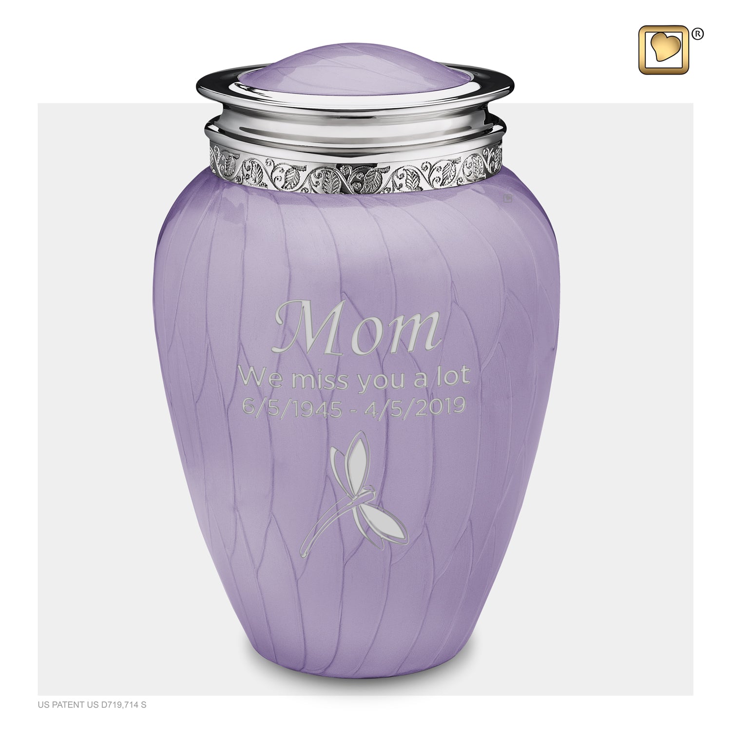 With our high-end artistry of laser engraving technology, you can add meaningful names, messages, and dates to this memorial. Kindly click the' personalize it' button to see how the text looks on the urn. This silver engraving stands in striking contrast to the pearlescent lavender finish, creating a dignified and meaningful tribute to your loved one.