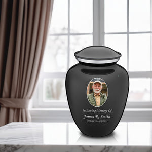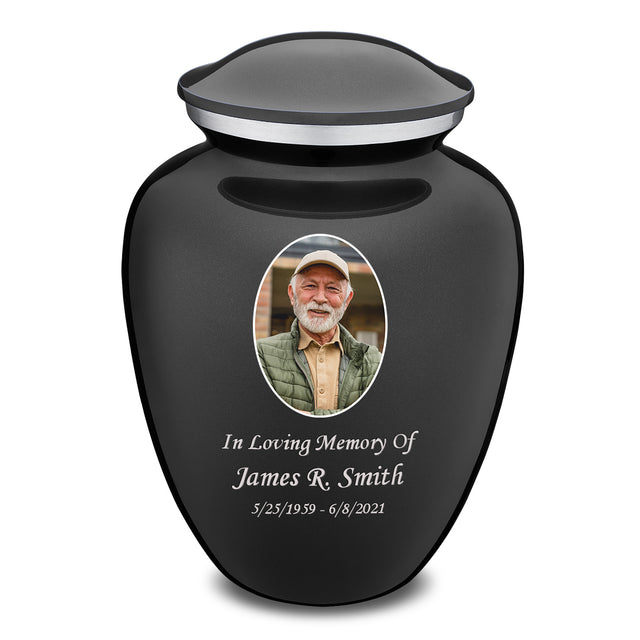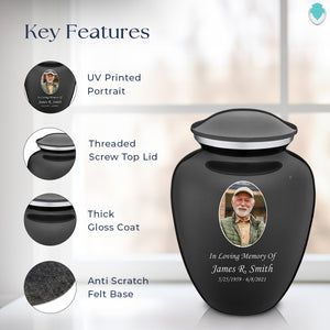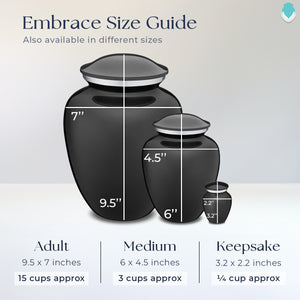 The Embrace Urn features a glossy charcoal finish with a brushed pewter band just below its threaded lid. The charcoal coloring represents sophistication, strength, and intelligence – qualities that made your loved one truly special. It's a beautiful tribute that captures their essence.