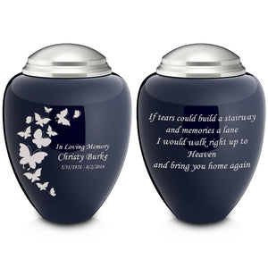 The hallmark of our Tribute Collection is the new, sleek oval silhouette in a selection of rich, gleaming colors accented with mixed metals that can only be found at GetUrns. This beautiful urn displays a flight of butterflies flying upwards. This is a perfect resting place for someone who embodied endurance, change, and renewal. This cremation urn’s sophisticated navy color and graceful brushed silver cap is aesthetically pleasing, ultramodern and symbolizes freedom, loyalty, inspiration, and devotion.