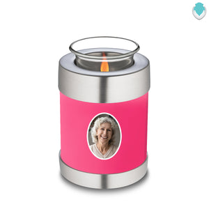 The Embrace Urn features a shiny bright pink finish with a brushed pewter band just below its threaded lid. The pink coloring represents love, playfulness, and harmony, creating a meaningful tribute to honor your loved one's memory.