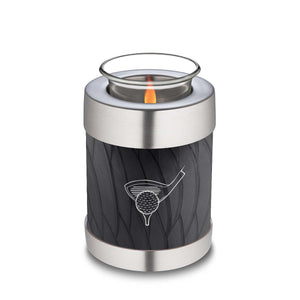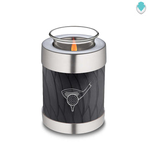 Honor the memory of your loved one with a Tealight Embrace Golfer Cremation Urn for Ashes. This beautiful urn displays a scene of a golfer swinging a club. This is a perfect resting place for someone who enjoyed golfing.
