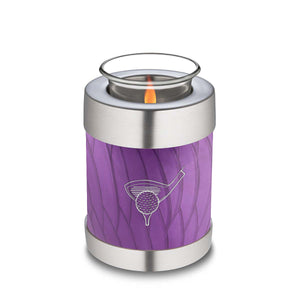 Honor the memory of your loved one with a Tealight Embrace Golfer Cremation Urn for Ashes. This beautiful urn displays a scene of a golfer swinging a club. This is a perfect resting place for someone who enjoyed golfing.