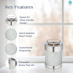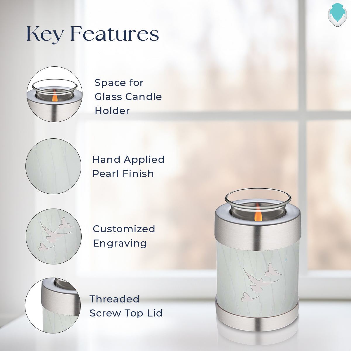 Honor the memory of your loved one with a Tealight Embrace Doves Cremation Urn for Ashes. This beautiful urn displays a flock of doves flying upwards. This is a perfect resting place for someone who embodied freedom and peace.