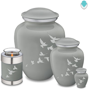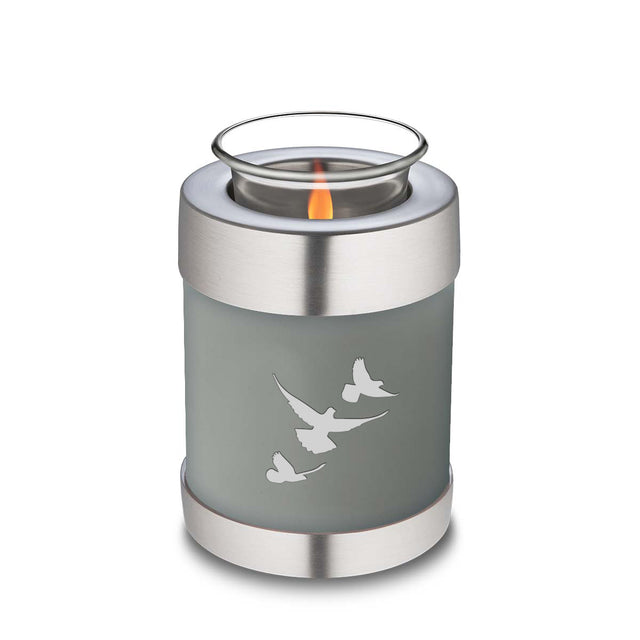 The Embrace Slate Grey Doves Cremation Tealight Urn offers a peaceful and contemplative way to honor a loved one. The gentle doves, symbolizing peace and eternal love, take flight against the serene backdrop of slate grey.