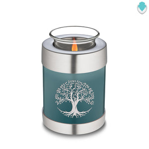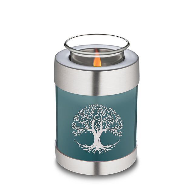 This Embrace Urn has a lovely glossy teal finish with a brushed pewter band just below its threaded lid. The teal coloring represents calmness, strength, and elegance.