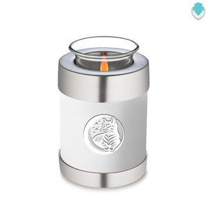This Embrace Urn has a deep glossy white finish with a brushed pewter band just below its threaded lid. The coloring represents sophistication, strength, and power.