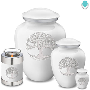 This Embrace Urn has a glossy white finish with a brushed pewter band just below its threaded lid. The white coloring represents innocence, hope, and serenity.