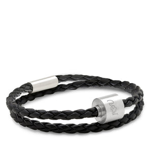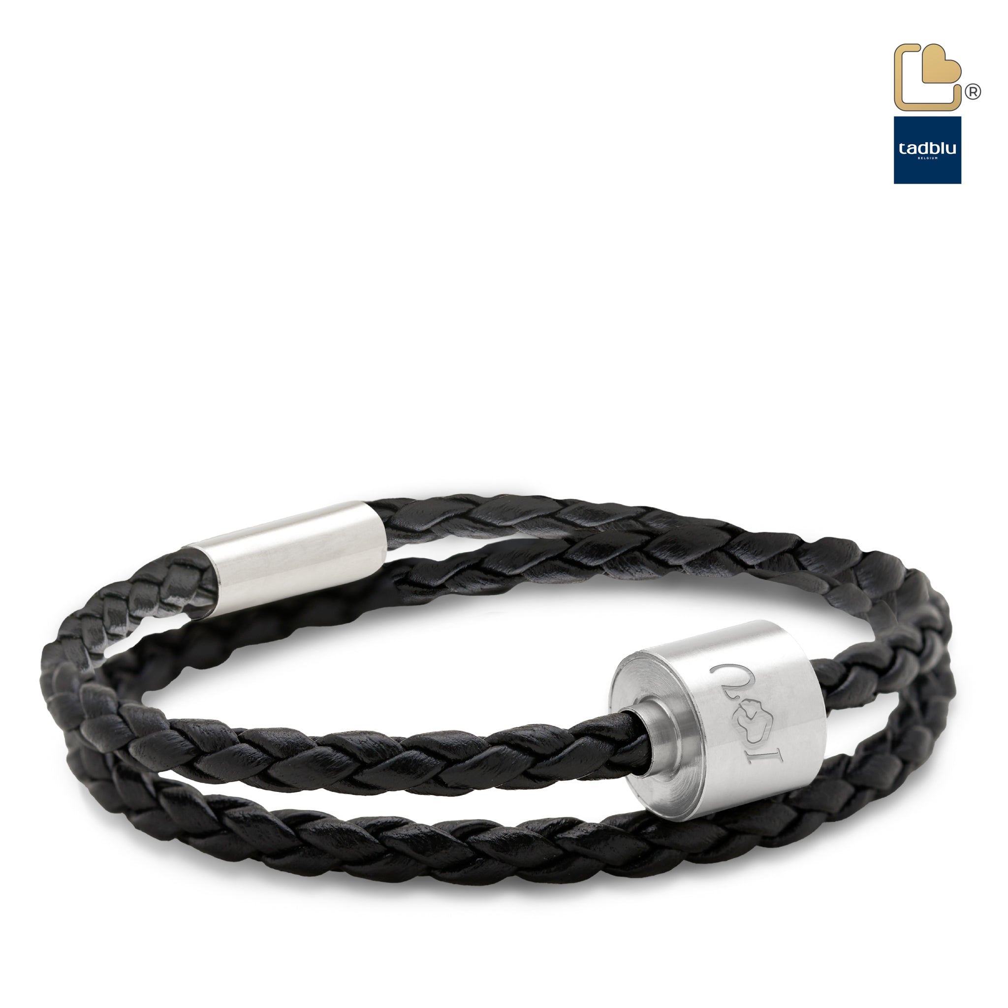 The leather comes in a rich, black tone that pairs beautifully with the stainless-steel accents. These accents include a small, cylindrical bead that functions as a container for just a pinch of ashes, which allows the wearer to keep a beloved family member or loved one close at all times.