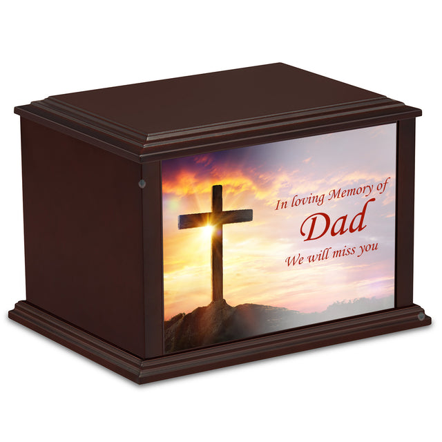 The Custom Printed Heritage Eternal Impressions Cross Wood Box Cremation Urns are elegant and modern in design. This is the perfect resting place for someone with unwavering faith and devotion.