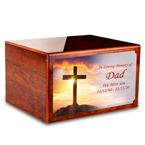 Cherish the memory of your loved one with the Custom Printed Heritage Cross Wood Box Cremation Urn. This is the perfect resting place for someone with unwavering faith and devotion.