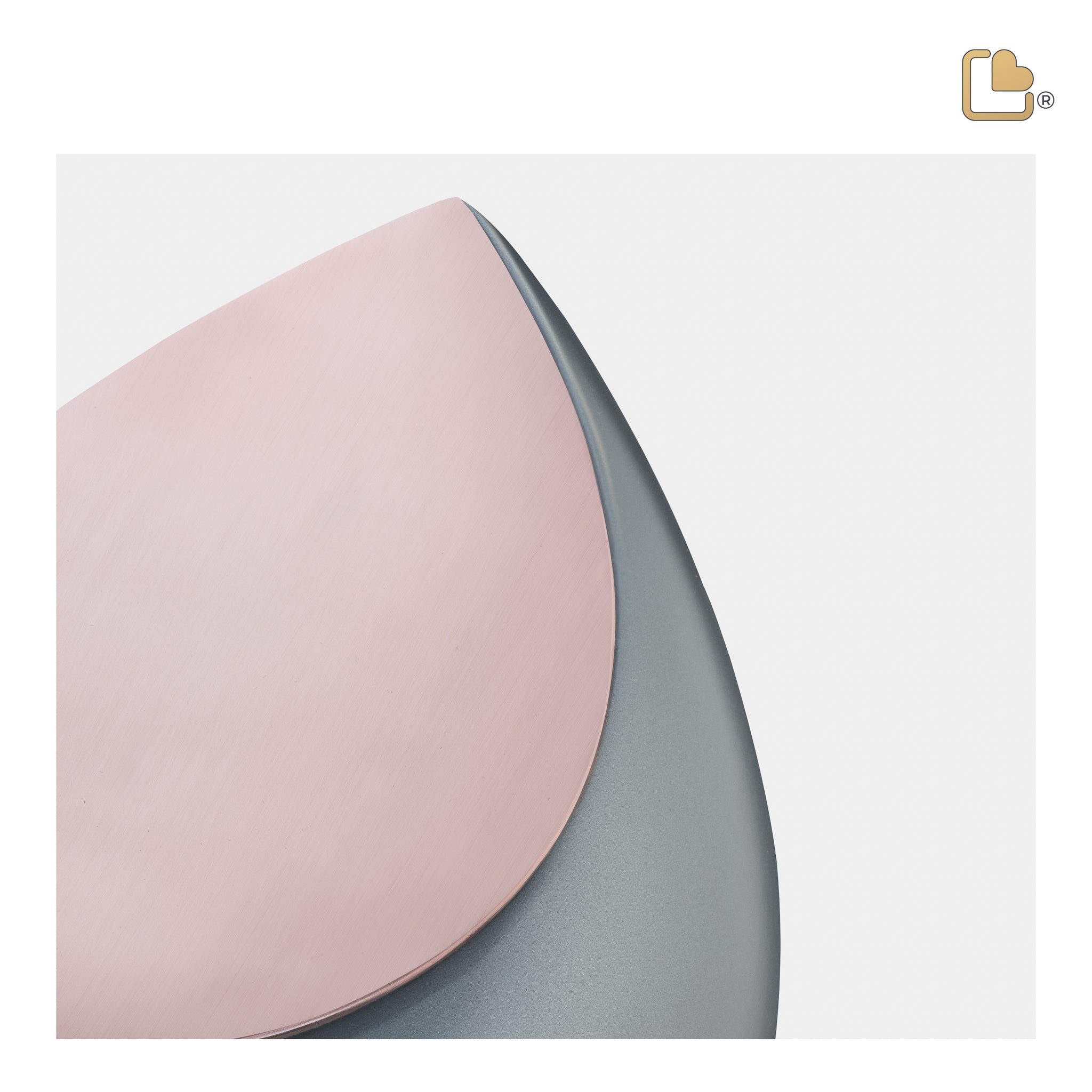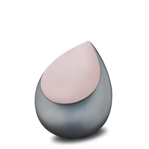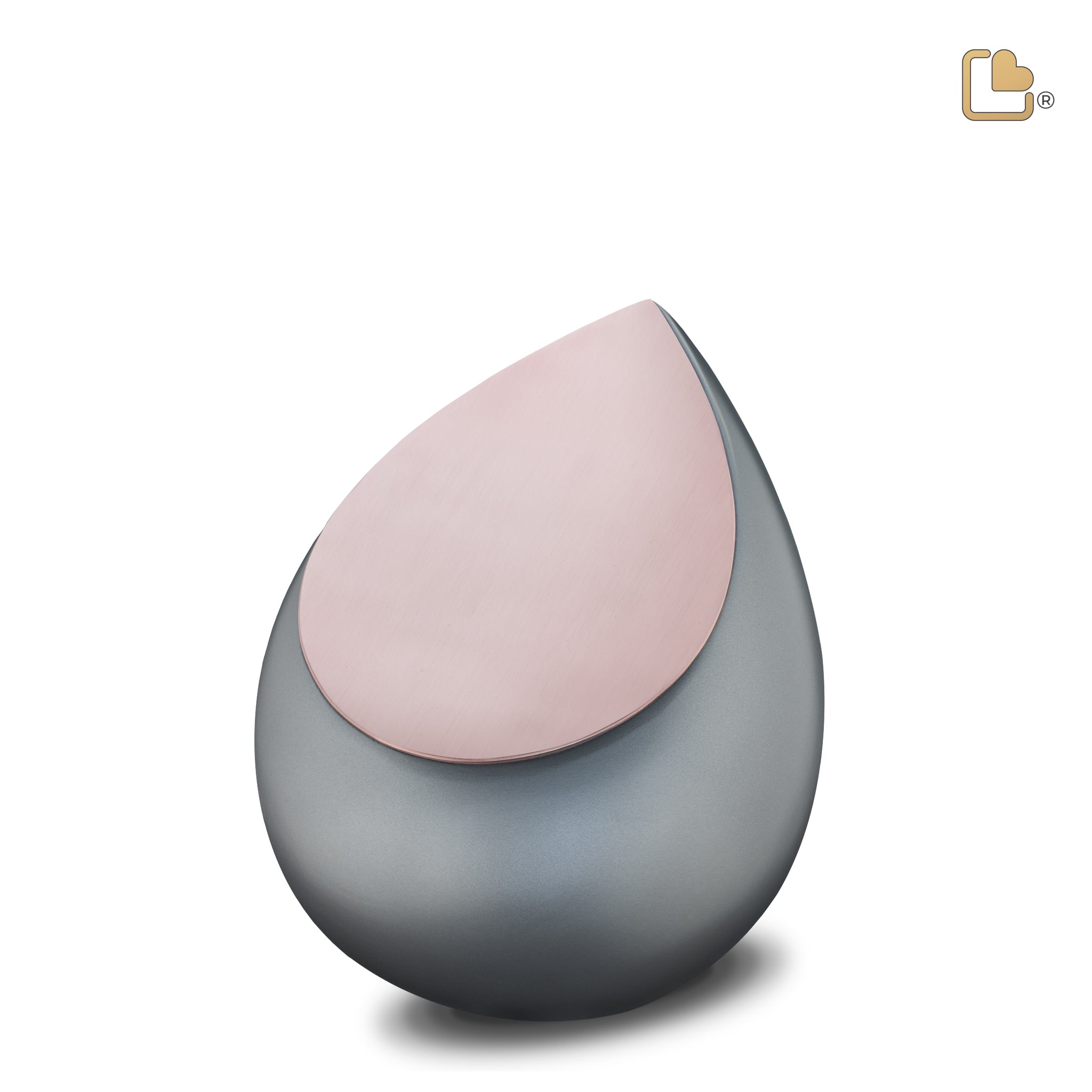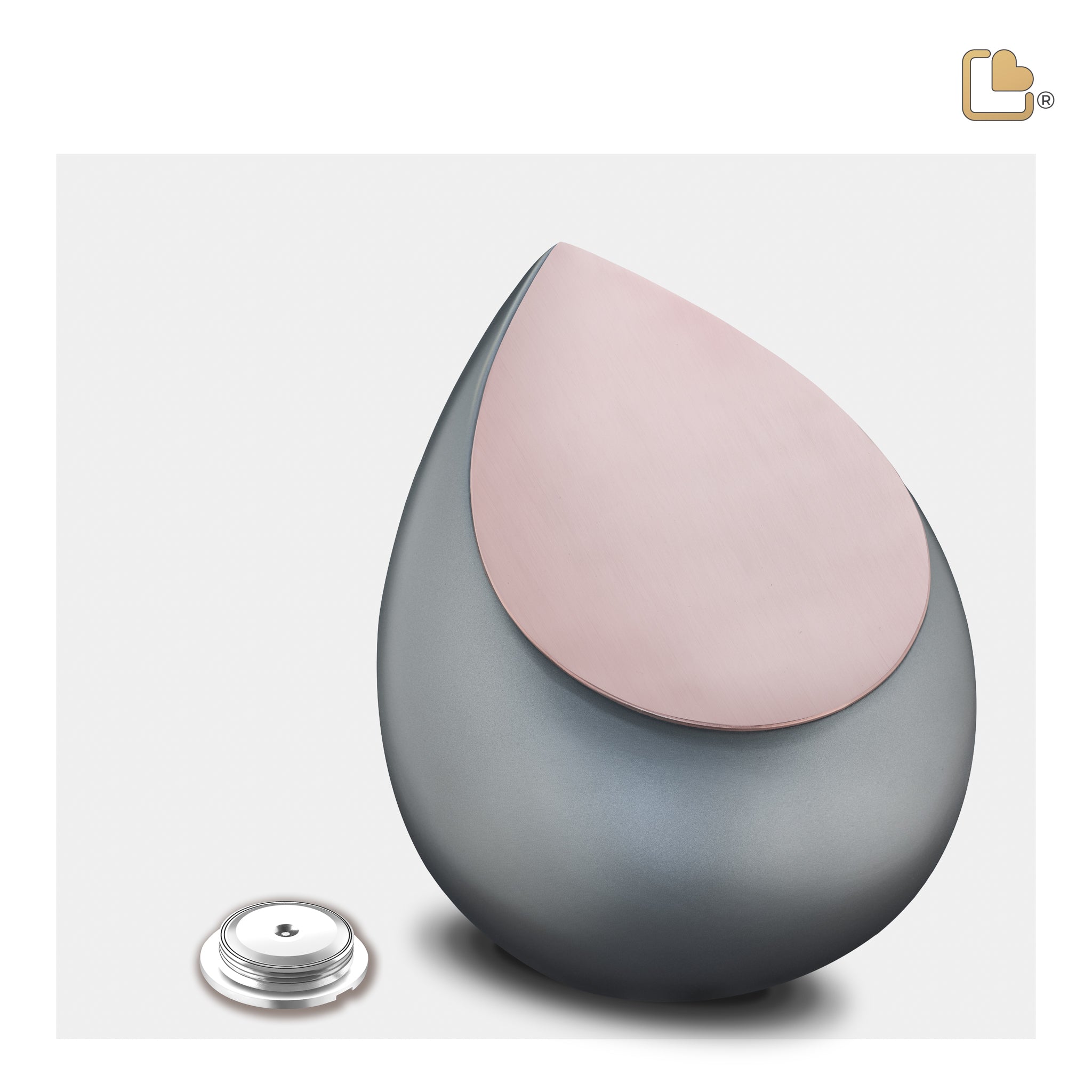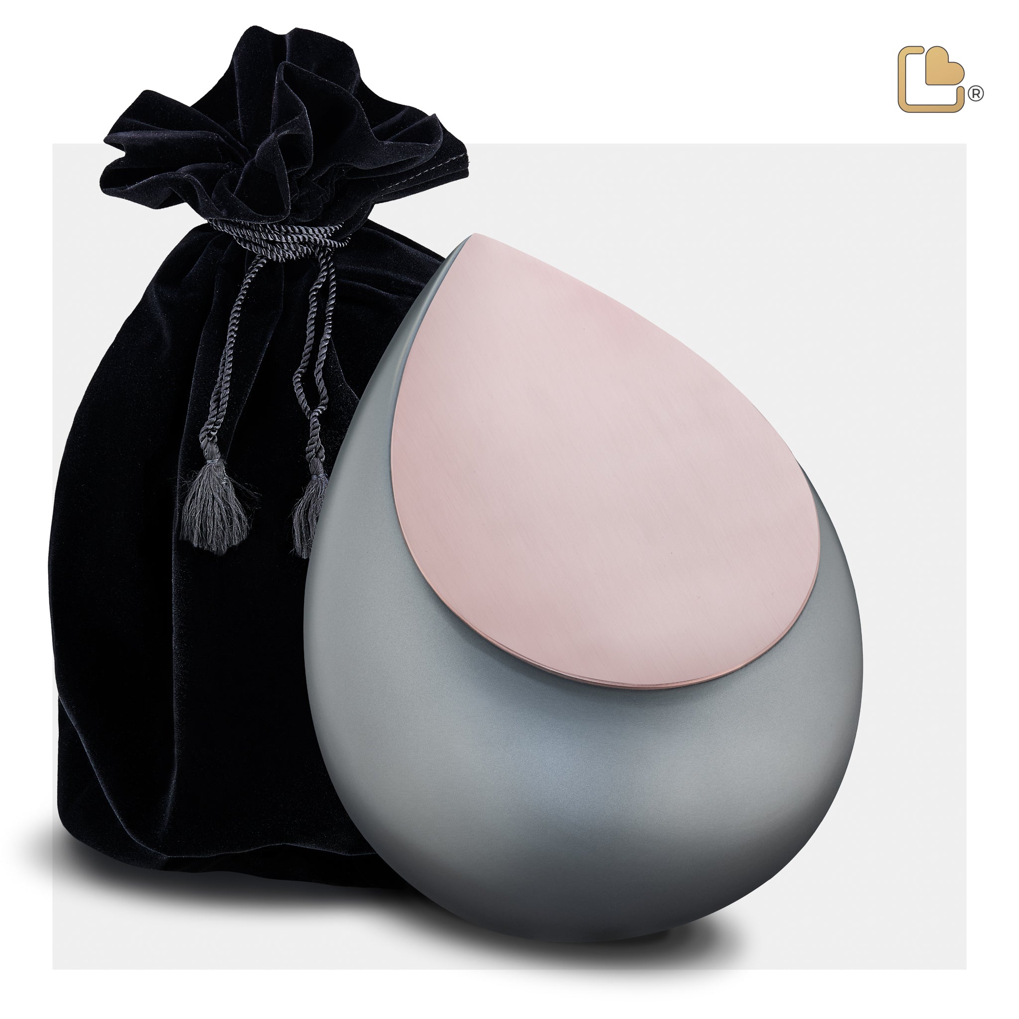 The Drop™ Medium Cremation Urn for sharing ashes exudes a sense of grace and tranquility. Its grey color represents depth and serenity, while the brushed rose gold accents add a touch of delicacy. This urn's design draws inspiration from the natural beauty of a teardrop, symbolizing the emotions and memories cherished within.