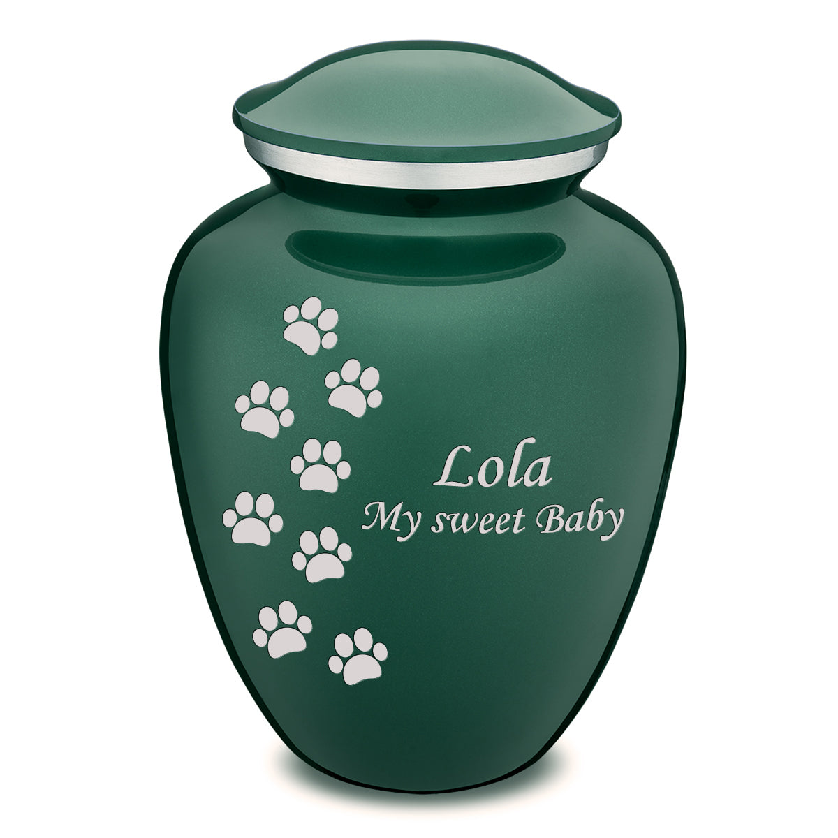 Honor the memory of your beloved pet with the Embrace Walking Paws Pet Cremation Urn for Ashes. This beautiful urn displays a path of tiny paws walking upwards. This is a perfect resting place and forever home for your furry friend.
