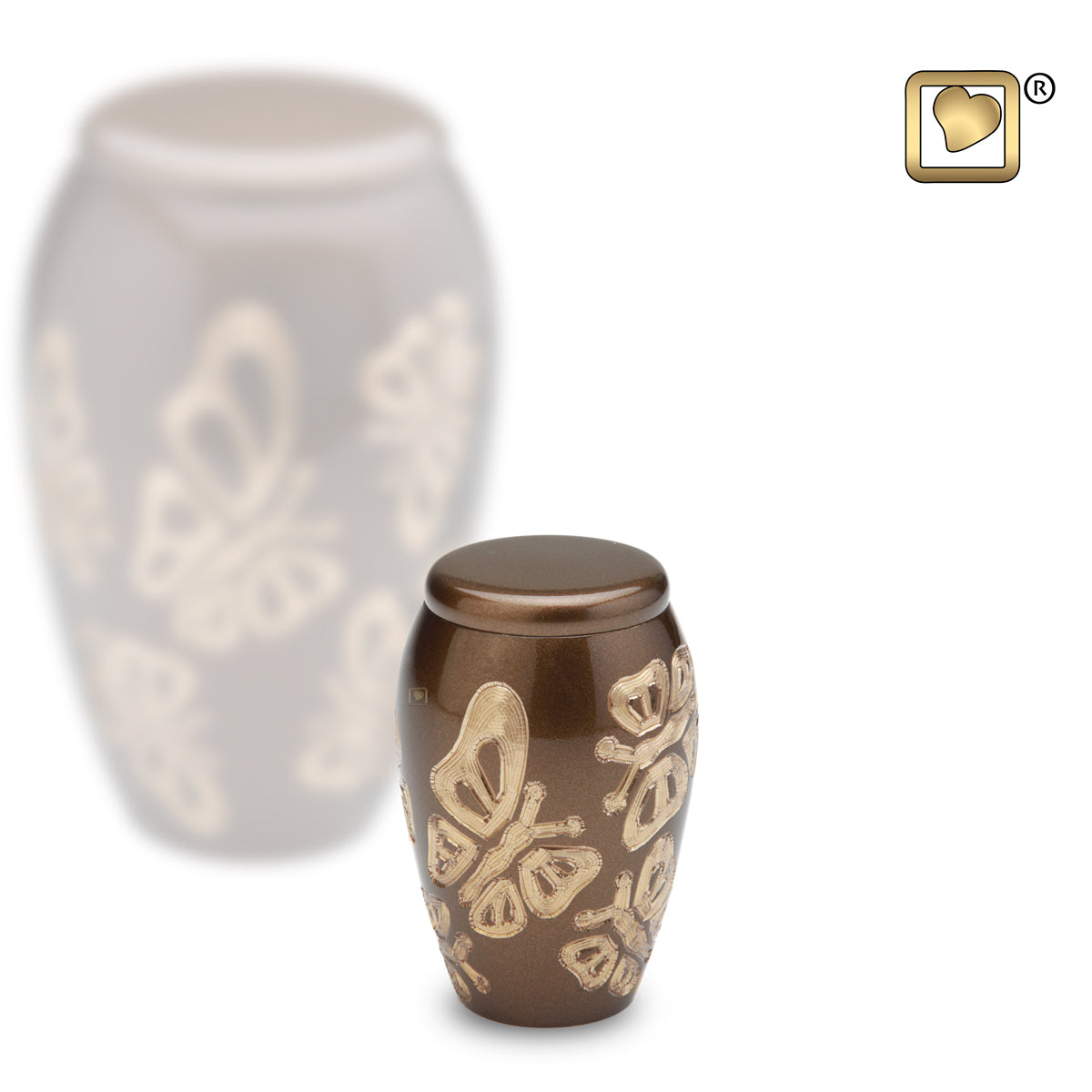 The Keepsake Butterflies is a keepsake sized metal cremation urn for ashes with a modern shape. The urn features a bronze color adorned with carefully hand engraved butterflies that reveal the shiny gold color of the metal beneath.