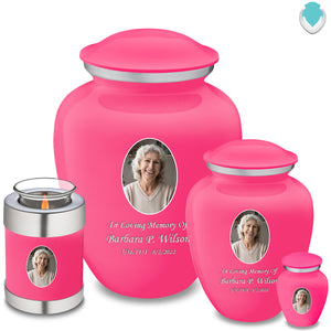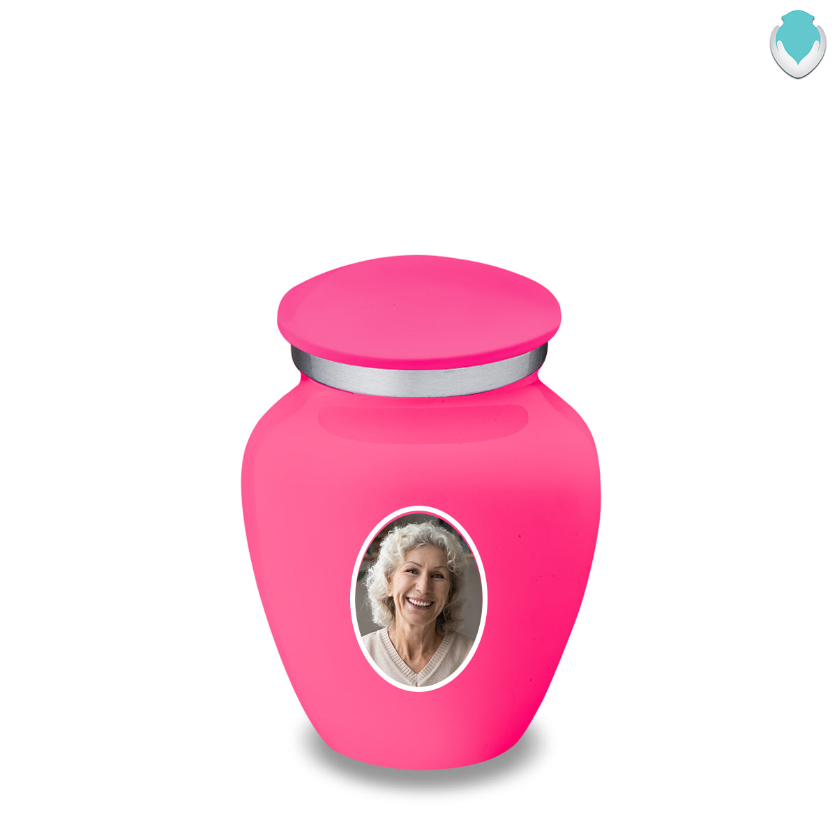 The Embrace Urn features a shiny bright pink finish with a brushed pewter band just below its threaded lid. The pink coloring represents love, playfulness, and harmony, creating a meaningful tribute to honor your loved one's memory.