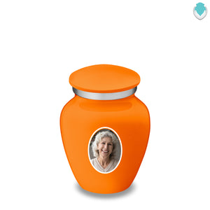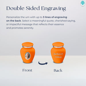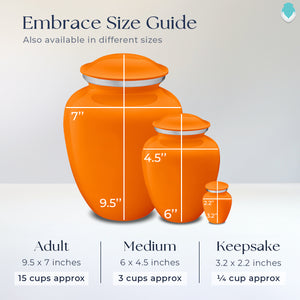 The Embrace Urn has a beautiful burnt orange finish with a brushed pewter band just below its threaded lid. The orange coloring represents transformation, creativity, and happiness, creating a meaningful tribute to honor your loved one's memory.