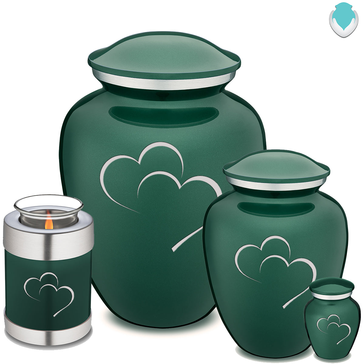 This Embrace Urn has a rich glossy green finish with a brushed pewter band just below its threaded lid. The green coloring represents the green of earthly life and nature, of vitality and energy.