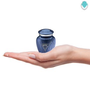 This Embrace Urn has a hand applied pearlescent cobalt blue finish with a brushed pewter band just below its threaded lid. The blue coloring freedom, inspiration, loyalty and devotion.