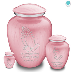 This Embrace Urn has a hand applied pearlescent pink finish with a brushed pewter band just below its threaded lid. The pink coloring represents joy, playfulness, and sweetness.
