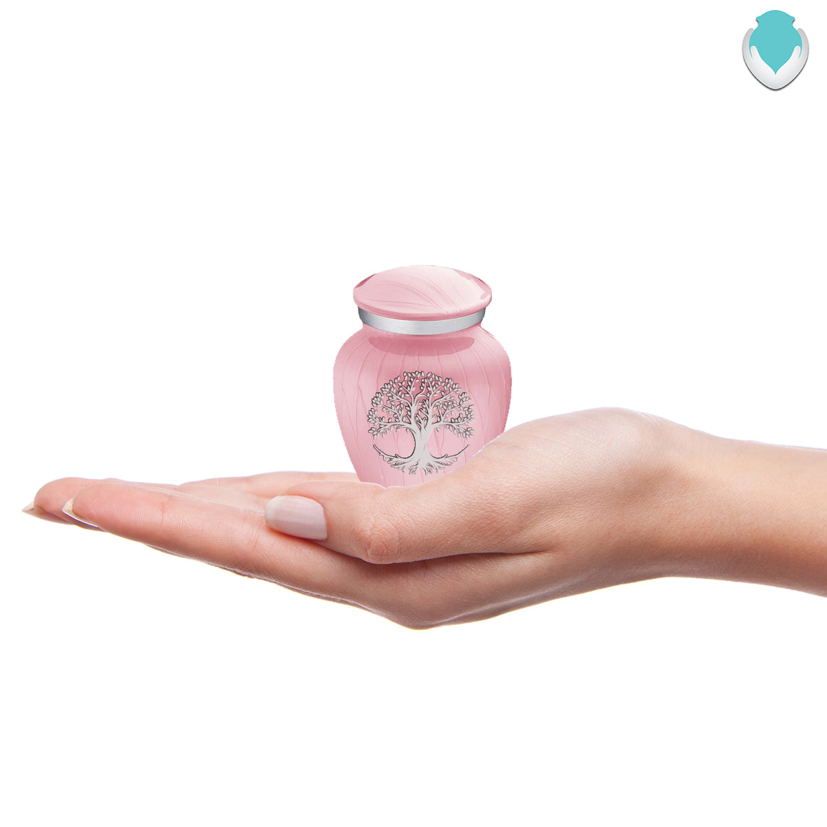 This Embrace Urn has a hand applied pearlescent pink finish with a brushed pewter band just below its threaded lid. The pink coloring represents joy, playfulness, and sweetness.