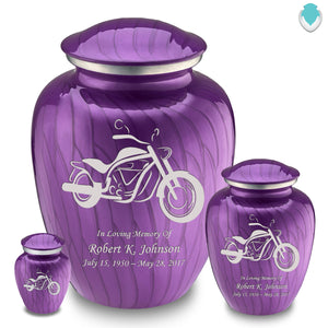 This Embrace Urn has an pearlescent purple finish with a brushed pewter band just below its threaded lid. The purple coloring represents peace, luxury, nobility, and devotion. Embrace Pearlescent have a beautiful striated texture across the surface of the urn and lid. These striations are formed by the expert craftsmen's fingers as they apply each stroke of paint by hand with precision and care.