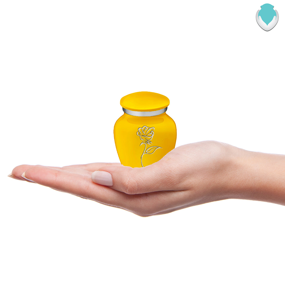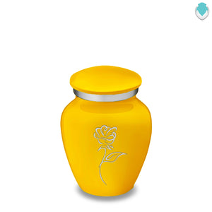 This Embrace Urn has a glossy yellow finish with a brushed pewter band just below its threaded lid. The yellow coloring represents remembrance, joy, and positivity.