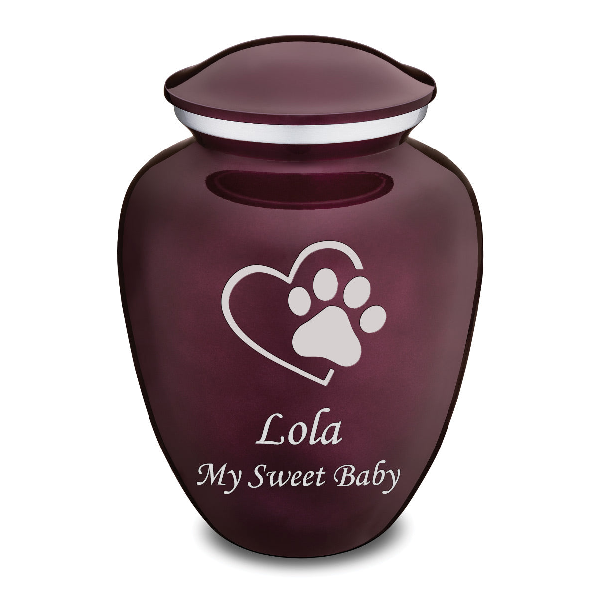 This Embrace Urn has a rich glossy cherry purple finish with a brushed pewter band just below its threaded lid. The cherry purple coloring represents happiness, loyalty, and devotion.