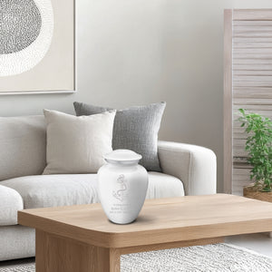 This Embrace Urn has a deep glossy White finish with a brushed pewter band just below its threaded lid. The White coloring represents sophistication, strength, and power.
