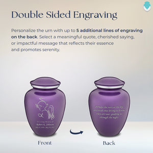 This Embrace Urn has an opaque glossy purple finish with a brushed pewter band just below its threaded lid. The purple coloring represents peace, luxury, nobility, and devotion.