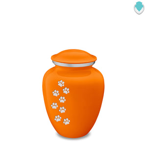 This Embrace Urn has a beautiful glossy orange finish with a brushed pewter band just below its threaded lid. The orange coloring represents transformation, creativity, and happiness.