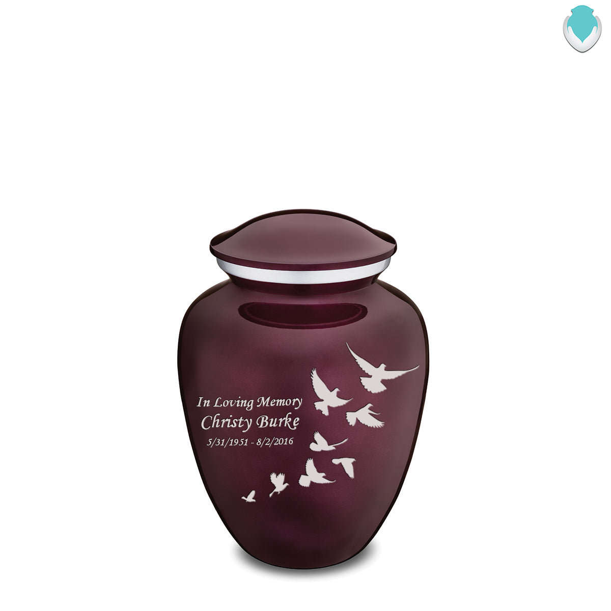 This Embrace Urn has a rich glossy cherry purple finish with a brushed pewter band just below its threaded lid. The cherry purple coloring represents happiness, loyalty, and devotion.