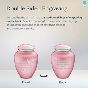 This Embrace Urn has a hand applied pearlescent pink finish with a brushed pewter band just below its threaded lid. The pink coloring represents joy, playfulness, and sweetness.