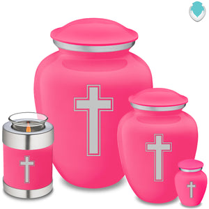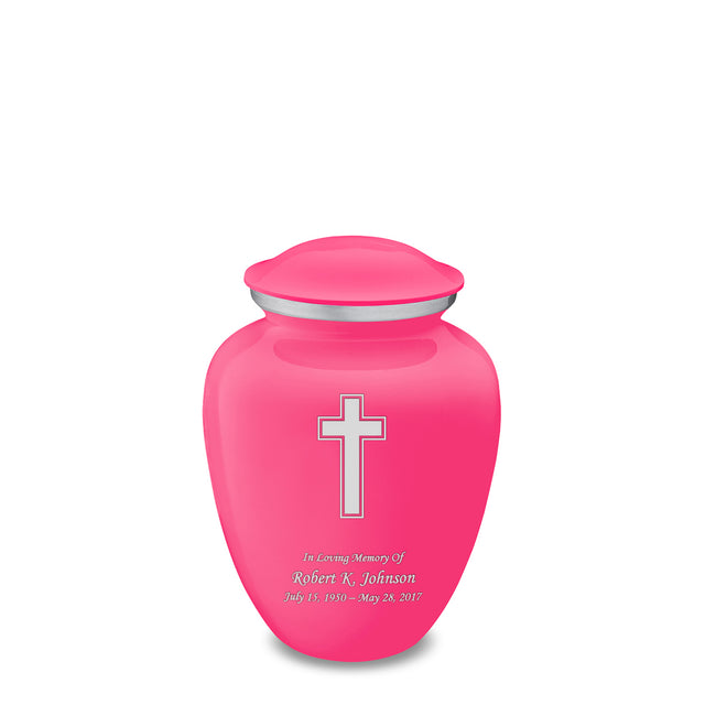 This Embrace Urn has a deep glossy bright pink finish with a brushed pewter band just below its threaded lid. The bright pink coloring represents love, playfulness, and harmony.