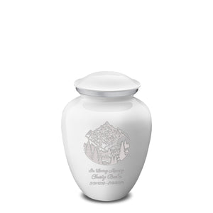 This Embrace Urn has a deep glossy White finish with a brushed pewter band just below its threaded lid. The White coloring represents sophistication, strength, and power.