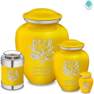 This Embrace Urn has a deep glossy yellow finish with a brushed pewter band just below its threaded lid. The yellow coloring represents sophistication, strength, and power.