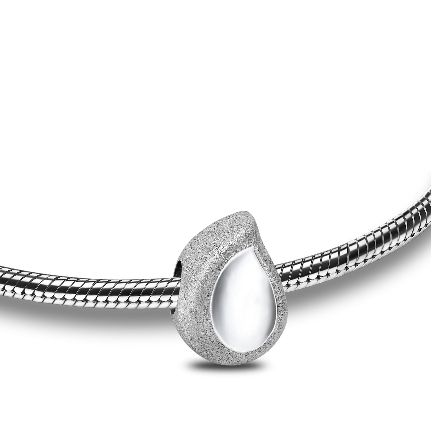 The bead has a small opening to allow the wearer to insert a small bit of ashes inside, so that you can keep your loved one close. The bead is shaped like a rounded teardrop, which reminds us of the power of our emotions and the validity of our sorrow. The outer edges of the teardrop have been given a textured finish, while the front face has a smooth and polished silver look, giving the bead a two-toned finish that enhances its beauty.
