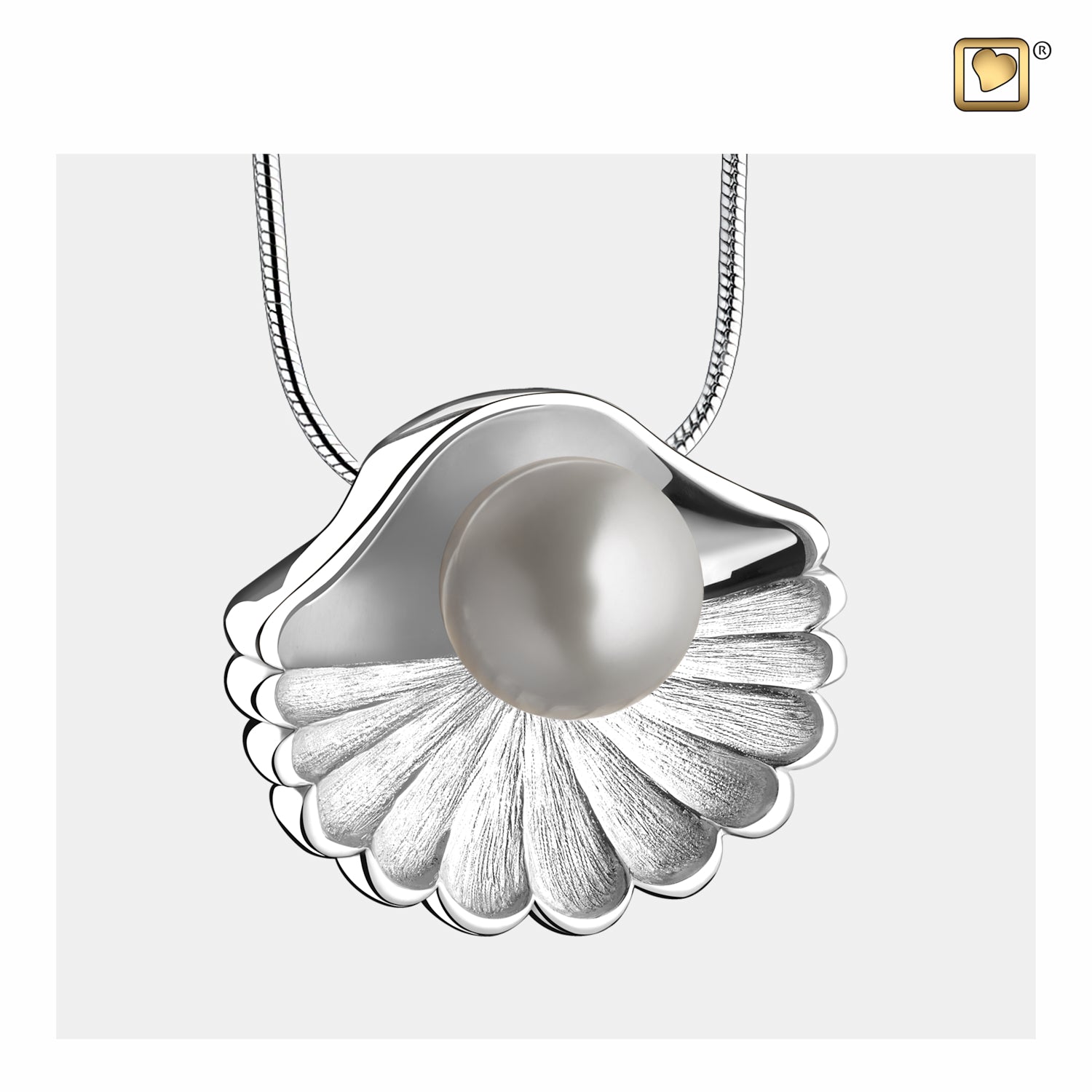 The design itself is incredibly stunning, as the cremation jewelry pendant takes on the form of a sea shell plucked perfectly from the ocean, with an exquisite pearl nestled in the center. The scalloped edges of the shell are slightly textured, bringin perfect balance to the smoked-gray upper portion.