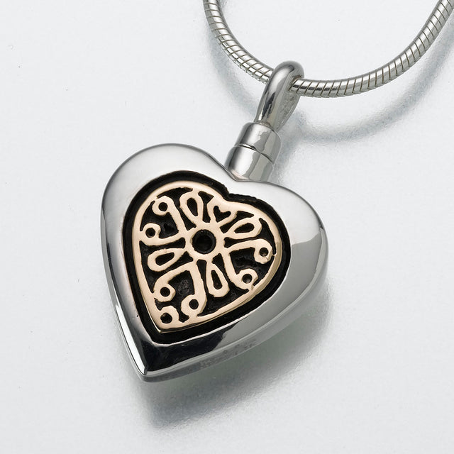 Our mid-size silver heart within a heart has a 14k gold antique filigree insert and is fillable through a threaded screw top. Each piece of cremation jewelry can hold a small amount of cremation ashes.