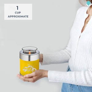 This Embrace Urn has a glossy yellow finish with a brushed pewter band just below its threaded lid. The yellow coloring represents remembrance, joy, and positivity